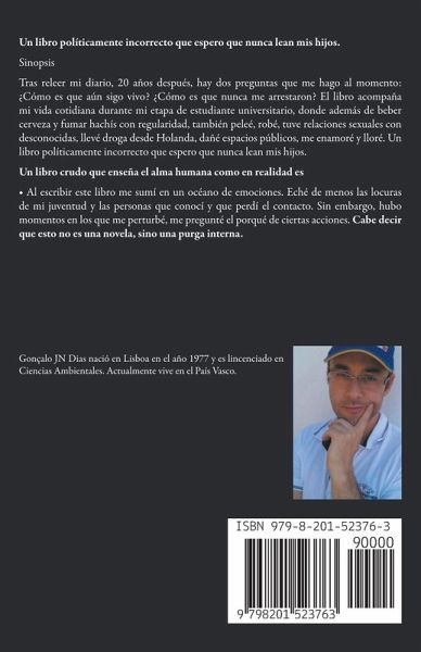 Un libro políticamente incorrecto que espero que nunca lean mis hijos. Sinopsis Tras releer mi diario, 20 años después, hay dos preguntas que me hago al momento: ¿Cómo es que aún sigo vivo? ¿Cómo es que nunca me arrestaron? El libro acompaña mi vida cotidiana durante mi etapa de estudiante universitario, donde además de beber cerveza y fumar hachís con regularidad, también peleé, robé, tuve relaciones sexuales con desconocidas, llevé droga desde Holanda, dañé espacios públicos, me enamoré y lloré. Un libro políticamente incorrecto que espero que nunca lean mis hijos. Un libro crudo que enseña el alma humana como en realidad es ¿ Al escribir este libro me sumí en un océano de emociones. Eché de menos las locuras de mi juventud y las personas que conocí y que perdí el contacto. Sin embargo, hubo momentos en los que me perturbé, me pregunté el porqué de ciertas acciones. Cabe decir que esto no es una novela, sino una purga interna.