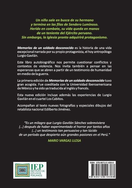 Memorias de un soldado desconocido es la historia de una vida excepcional narrada por su propio protagonista, el hoy antrop logo Lurgio Gavil n. Este libro autobiogr fico nos permite cuestionar conflictos y contextos de violencia. Nos invita tambi n a pensar en las esperanzas que se abren a partir de un testimonio de humanidad en medio de la guerra. La primera edici n de Memorias de un soldado desconocido tuvo gran acogida. Fue coeditada con la Universidad Iberoamericana de M xico y ha sido ya traducida al ingl s y franc s. Esta nueva edici n incluye adem s las experiencias de Lurgio Gavil n en el cuartel Los Cabitos. Acompa an al texto nuevas fotograf as y especiales dibujos del retablista nacional Edilberto Jim nez.