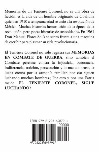 Memorias de un Teniente Coronel, no es una obra de ficción, es la vida de un hombre originario de Coahuila quien en 1910 a temprana edad se unió a la revolución de México. Muchas historias hemos leído de la época de la revolución, pero pocas historias de sus soldados. En 1961 Don Manuel Flores Solís se sentó frente a una maquina de escribir para plasmar su vida revolucionaria. El Teniente Coronel no sólo registra sus MEMORIAS EN COMBATE DE GUERRA, sino también el Combate perenne contra la injusticia, burocracia, indiferencia, traición, persecución y lo más doloroso, la lucha eterna por la armonía familiar, por eso siguen luchando muchos hombres.¡ Por esto y por una Patria mejor EL TENIENTE CORONEL, SIGUE LUCHANDO!