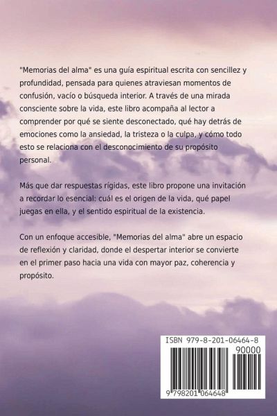 DESCUBRE EL SENTIDO DE LA VIDA Y CUÁL ES TU MISIÓN EN ELLA. ¿Te has preguntado qué sentido tiene la vida? ¿Quieres saber cuál es tu propósito de vida? ¿Te sientes desorientado y perdido en la vida? En MEMORIAS DEL ALMA encontrarás respuestas a estas y muchas otras preguntas que pondrán fin a la búsqueda incansable de respuestas acerca de la verdad sobre la vida y el para qué de tu existencia en ella. La ansiedad, la tristeza, la culpa, la envidia, los celos, la comparación, la competencia, la angustia, y otras emociones densas, son síntomas de que no tienes consciencia sobre la Vida ni tu propósito en ella. ¡Descúbrelo y reclama la paz que te mereces! ''MEMORIAS DEL ALMA'' es un libro de espiritualidad para el despertar de la conciencia y empoderamiento del alma, que ofrece al lector una mirada diferente sobre la vida y el ser humano, utilizando un lenguaje sencillo, ameno y adecuado para los tiempos modernos. Aquí encontrarás respuestas a estas y otras preguntas: El origen de la vida. En qué consiste la vida. Cuál es el sentido de la vida. Cómo jugar el juego de la vida. Cuál es tu propósito o misión de vida. Cuál es tu rol en la vida. Cuál es tu verdadera naturaleza. Si estás en búsqueda de respuestas sobre los diferentes aspectos de la vida y tu existencia en ella, MEMORIAS DEL ALMA te proporcionará las respuestas muy puntuales y certeras, para que, al recordar la Verdad, puedas descansar en ella. ¡Tu alma tiene algo muy importante que recordar!