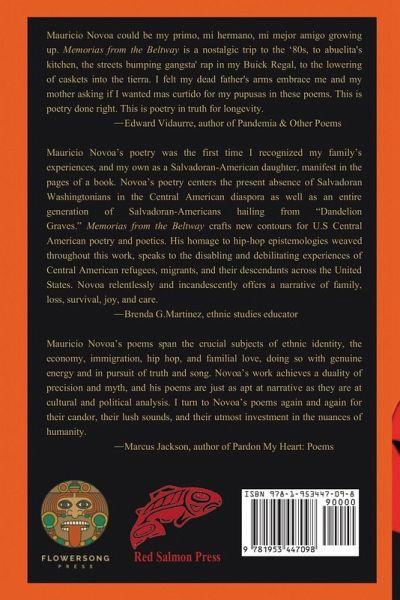 Memorias from the Beltway is our first FlowerSong Press joint publication and the fourth Red Salmon Press full-length book dedicated to poetry illuminating the words and verses of nascent and established Chicanx/ Latinx/Native American writers. Through our respective presses, we seek to rupture the hierarchical ways traditional modes of publishing insist upon only celebrating the works of the most widely-recognized or prolific authors and marginalizing the leading voices of Chicanx/ Latinx/Native American/POC communities that are constantly innovating and creating. As Red Salmon Press, we are proud that Mauricio Novoa's provocative collection centers on the Central American experience. After over two decades, we are fulfilling a mandate to fully embrace that panoply of Chicanx/Latinx/Native American literary perspectives, which are integral to (re)defining who and what we are. In this work, we are held at attention to listen and contend with themes of working class survivalism and ingenuity, spiritual tenacity, hip hop articulations, and el exilio via the poems of Mauricio, and his generation, to disrupt our own understandings of plural Latinidad. Poems such as "Happy Meals" to "Memorias from the Beltway" encapsulate nuances about salvadoreño masculinity through imagery of everyday forms of violence and resistance marking a thread between state-sponsored, insurgent, street sites for these expressions. Other pieces demonstrate a quiet invocation of memory, place, and intergenerationality that transports us to the perennial beats of the East Coast and prayers of abuelas. Last, the layers of familial strife, bonds, and strength depicted are a subtle ode to Mauricio's immigrant parents that is neither nostalgic nor cloying. Twenty-five years after the publication the East of the Freeway by raúlrsalinas, Memorias from the Beltway is a much needed repuesta to the recollections, which raúl explores in another time of vast global, sociopolitical transformation and popular, grassroots uprisings. The intimate manner in which both Mauricio and raúl communicate the soulfulness of our rebellion through sparse and intentional words is certainly one point of commonality. Their love of la vida cotidiana is another moment of intersection. Undoubtedly, it is in these small acts of calling our existence that we persevere. Memorias from the Beltway implores us to dwell in these remembrances, mourn our losses, and honor the words we carve out as "lifelines." -Lilia Rosas, Ph.D. Executive Director, Red Salmon Arts Osten, Tejaztlán, Otoño 2020