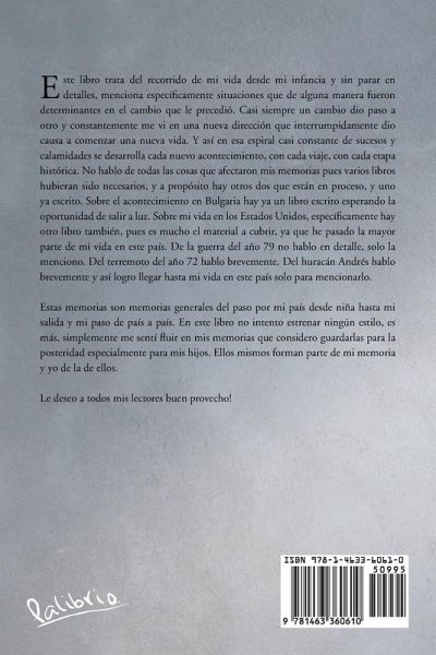 Se trata del recorrido de mi vida desde mi infancia y sin parar en detalles, menciona específicamente situaciones que de alguna manera fueron determinantes en el cambio que le precedió.Casi siempre un cambio dio paso a otro y constantemente me ví en una nueva dirección que interrumpidamente dió causa a comenzar una nueva vida. Y así en esa espiral casi constante de sucesos y calamidades se desarrolla cada nuevo acontecimiento, con cada viaje, con cada etapa histórica. No hablo de todas las cosas que afectaron mis memorias pues varios libros hubieran sido necesarios, y a propósito hay otros dos que están en proceso, y uno ya escrito. Sobre el acontecimiento en Bulgaria hay ya un libro escrito esperando la oportunidad de salir a luz. Sobre mi vida en los Estados Unidos, específicamente hay otro libro también, pues es mucho el material a cubrir, ya que he pasado la mayor parte de mi vida en este país. De la guerra del año 79 no hablo en detalle, solo la menciono. Del terremoto del año 72 hablo brevemente. Del huracán Andrés hablo brevemente y así logro llegar hasta mi vida en este país solo para mencionarlo. Estas memorias son memorias generales del paso por mi país desde niña hasta mi salida y mi paso de país a país. En este libro no intento estrenar ningún estilo, es más, simplemente me sentí fluir en mis memorias que considero guardarlas para la posteridad especialmente para mis hijos. Ellos mismos forman parte de mi memoria y yo de la de ellos. Le deseo a todos mis lectores buen provecho!