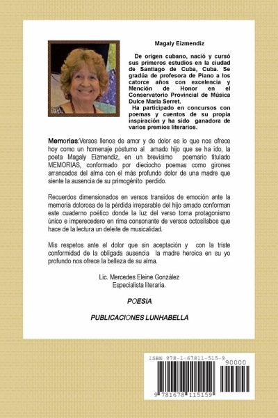 Versos llenos de amor y de dolor es lo que nos ofrece hoy como un homenaje póstumo al amado hijo que se ha ido, la poeta Magaly Eizmendiz, en un brevísimo poemario titulado MEMORIAS, conformado por dieciocho poemas como girones arrancados del alma con el más profundo dolor de una madre que siente la ausencia de su primogénito perdido.