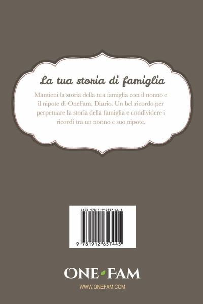 Conserva la tua storia di famiglia con il bellissimo diario di Nonno e nipote di OneFam. Un bellissimo ricordo per mantenere viva la storia della famiglia e condividere i ricordi tra un nonno e suo nipote. Ogni nipote si chiede come suo nonno abbia vissuto la sua vita, le sue storie, le sue avventure, i suoi amori e i suoi ricordi. Con questo diario splendidamente illustrato, puoi raccontare la tua storia a tuo nipote come se fossero proprio lì con te. Con semplici domande e suggerimenti per stimolare ricordi, sezioni di foto e opportunità di storie questo diario diventerà un tesoro di famiglia inestimabile, che il tuo nipote apprezzerà per tutta la vita. Le domande e le domande guidate ti aiutano a raccontare la tua storia, dai primi anni alla tua adolescenza fino all'Amore e al matrimonio. Illustrazioni splendidamente disegnate per rendere questo un bellissimo regalo duraturo Ottimo modo per raccontare a tuo nipote la tua storia Ottimo modo per trasmettere i valori familiari Carta senza acidi per conservare i tuoi ricordi per tutta la vita 6in * 9in, 144 pagine Libro di memorie del nonno
