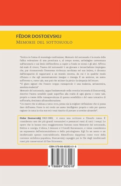 "Scritto in forma di monologo-confessione, Memorie del sottosuolo è la storia della fallita redenzione di una prostituta e, al tempo stesso, un'indagine tormentata sull'inconscio e sui limiti dell'intelletto a capire a fondo se stessi e gli altri. Affetto dal male di vivere, 'l'uomo del sottosuolo' è un giovane e inconcludente impiegato che, pur riconoscendo l'immensa ricchezza racchiusa nel suo intimo, è divorato dall'incapacità di rapportarsi a un mondo esterno, da cui è in qualche modo rifiutato e che egli ossessivamente insegue e rinnega. È un antieroe, un uomo sofferente e, come tale, non può che attirare la pietà e la simpatia del lettore. "Vi giuro signori che l'essere troppo consapevole è una malattia, un'autentica, assoluta malattia" Memorie del sottosuolo, tappa fondamentale nella crescita letteraria di Dostoevskij, descrive l'uomo sensibile quale superfluo alla realtà di ogni giorno e come tale, proprio a causa della consapevolezza di questa sensibilità e del vano tentativo di soffocarla, destinato all'autodistruzione. "Un essere che si abitua a tutto: ecco, penso sia la migliore definizione che si possa dare dell'uomo. Forse io mi credo un uomo intelligente proprio e solo per questa ragione: in tutta la vita non mi è mai riuscito di portare a termine alcunché"