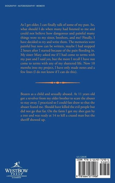 As I get older, I can finally talk of some of my past. So, what should I do when many had listened to me and could not believe how dangerous and painful many things were to my sister, brothers, and me? Finally, I have decided to try and write them. The memories were painful but now can be written, maybe I had stopped 2 hours after I started because of the pain flooding in. My sister Mary asked me if I had come to terms with my past and I said yes, but the more I recall I have not come to terms with any of my shattered life. Now 10 months into my project, I have only made notes and a few lines (I do not know if I can do this).…mehr