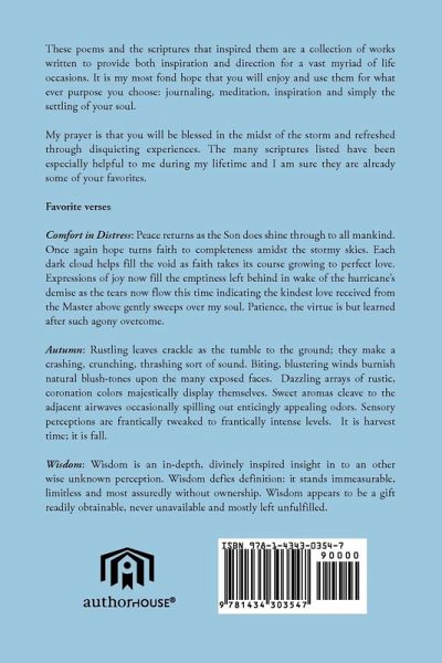 These poems and the scriptures that inspired them are a collection of works written to provide both inspiration and direction for a vast myriad of life occasions. It is my most fond hope that you will enjoy and use them for what ever purpose you choose: journaling, meditation, inspiration and simply the settling of your soul. My prayer is that you will be blessed in the midst of the storm and refreshed through disquieting experiences. The many scriptures listed have been especially helpful to me during my lifetime and I am sure they are already some of your favorites. Favorite verses Comfort in Distress: Peace returns as the Son does shine through to all mankind. Once again hope turns faith to completeness amidst the stormy skies. Each dark cloud helps fill the void as faith takes its course growing to perfect love. Expressions of joy now fill the emptiness left behind in wake of the hurricane's demise as the tears now flow this time indicating the kindest love received from the Master above gently sweeps over my soul. Patience, the virtue is but learned after such agony overcome. Autumn: Rustling leaves crackle as the tumble to the ground; they make a crashing, crunching, thrashing sort of sound. Biting, blustering winds burnish natural blush-tones upon the many exposed faces. Dazzling arrays of rustic, coronation colors majestically display themselves. Sweet aromas cleave to the adjacent airwaves occasionally spilling out enticingly appealing odors. Sensory perceptions are frantically tweaked to frantically intense levels. It is harvest time; it is fall. Wisdom: Wisdom is an in-depth, divinely inspired insight in to an other wise unknown perception. Wisdom defies definition: it stands immeasurable, limitless and most assuredly without ownership. Wisdom appears to be a gift readily obtainable, never unavailable and mostly left unfulfilled.