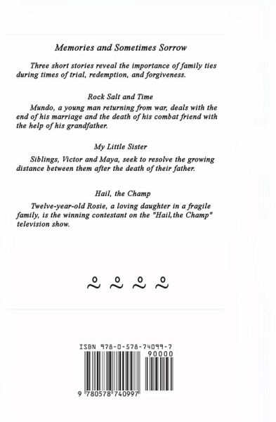 Memories and Sometimes Sorrow Three short stories reveal the importance of family ties in times of trial, redemption, and forgiveness. Rock Salt and Time Mundo, a young man returning from war, deals with the end of his marriage and the death of a combat friend with the help of his Grandfather. My Little Sister Siblings, Victor and Maya, seek to resolve the growing distance between them after the death their father. Hail, the Champ Twelve-year-old Rosie, a loving daughter in a fragile family, is the winning contestant on the television show, "Hail, the Champ." ¿ ¿ ¿ ¿