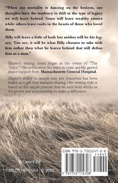 When our mortality is dancing on the horizon, our thoughts have the tendency to drift to the type of legacy we will leave behind. Some will leave wealthy estates while others leave voids in the hearts of those who loved them. Billy will leave a little of both but neither will be his legacy. You see, it will be what Billy chooses to take with him rather than what he leaves behind that will define him as a man.