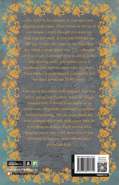 One night in the summer, at 2am and i was giggling your name. Three words on the tip of my tongue. i really thought you were my four-ever and more. It was your birthday the 5th day of June. Six pages in my diary that day which i wrote about you. 777...i thought of it as a sign. I dreamed of us in a boat in the lake playing cards. you pulled out an 8 numbered card and my cards were all jokers.. For a while i was on cloud 9. i wanted to yell out that i loved you 10,000 times. One day in the winter it all changed. 2am was full of crying and the three words no longer sounded true. It turned from four-ever to never-ever, we couldn't proceed five minutes without bickering. The six pages made my heart crumple and it only took seven days for everything to change. Eight unread texts begging you to stay. I fell from cloud 9 and drowned in the very same lake we once played cards in.
