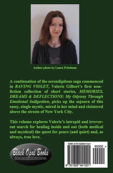 A continuation of the serendipitous saga commenced in RAVING VIOLET, Valerie Gilbert's first non-fiction collection of short stories, MEMORIES, DREAMS & DEFLECTIONS: My Odyssey Through Emotional Indigestion, picks up the sojourn of this sassy, single mystic, mired in her mind and cloistered above the streets of New York City. This volume explores Valerie's intrepid and irreverent search for healing inside and out (both medical and mystical), the quest for peace (and quiet), and, as always, true love.