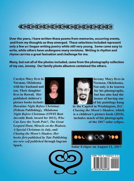 Over the years, I have written these poems from memories, occurring events, and from my thoughts as they emerged. These selections included represent only a few as I began writing poetry while still very young. Some came easy to write, while others have undergone many revisions. Writing in rhythm and rhyme carries a great fascination and challenge for me. Many, but not all of the photos included, came from the photography collection of my son, Jeremy. Our family photo albums contained the others. Carolyn Macy lives in Norman, Oklahoma with her husband and son. Their daughter lives in Hawaii. Her published children's picture books include: Hawaiian Night Before Christmas (Pelican Publishing), Oklahoma Night Before Christmas (OWFI Best Juvenile Book Award for 2013), Who Can Save the North Pole?, The Great Leopard Hunt, Miracle on the Hudson, A Special Christmas in July, and Chasing the Moon's Shadow. Her books first published by Tate Publishing are now self published through Ingram Spark. Jeremy Macy lives in Norman, Oklahoma. Not only is is known for his photography, but has also had the honor of having his paintings hang in the Capitol in Washington, D.C. Chasing the Moon's Shadow, which is a children's picture book (2018), includes much of his photography of the 2017 solar eclipse.