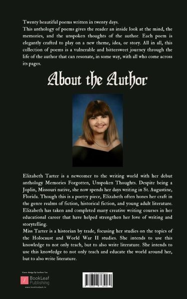 ""Twenty beautiful poems written in twenty days. This anthology of poems gives the reader an inside look at the mind, the memories, and the unspoken thoughts of the author. Each poem is elegantly crafted to play on a new theme, idea, or story. All in all, this collection of poems is a vulnerable and bittersweet journey through the life of the author that can resonate, in some way, with all who come across its pages. ""