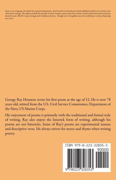 From a very young age, the author has enjoyed writing poetry. Ray has had several books previously published and this one contains some of his latest writings. His subjects include the beauties of God's creation, poems about love and loss, family and friends, historical poems about his native Worth County, Georgia and Confederate history. Though now in his golden years, his youthful pen is always dispensing new verses.