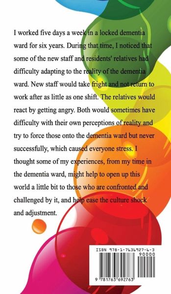 I worked five days a week in a locked dementia ward for six years. During that time, I noticed that some of the new staff and resident's relatives had difficulty adapting to the reality of the dementia ward. New staff would take fright and not return to work after as little as one shift. The relatives would react by getting angry. Both would sometimes have difficulty with their own perceptions of reality and try to force those onto the dementia ward but never successfully, which caused everyone stress. I thought some of my experiences, from my time in the dementia ward, might help to open up this world a little bit to those who are confronted and challenged by it, and help ease the culture shock and adjustment.