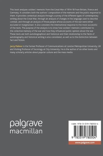 This book analyses soldiers' memoirs from the Great War of 1914-18 from Britain, France and Germany. It considers both the authors' composition of the memoirs and the public response to them. It provides contextual analysis through a survey of the different types of contemporary writing about the Great War, through an analysis of changes in the language used to describe combat, and through an analysis of those people whose accounts of the war were either excluded or marginalised. It also considers the international response to the most successful of the texts. The purpose of the analysis is to show how soldiers' memoirs contributed to the collective memory of the war and how they influenced public opinion about the war. These texts are both autobiographical and historical and their relationship to the fields of autobiography and historical writing is also considered, as well as to the distinction between fact and fiction.