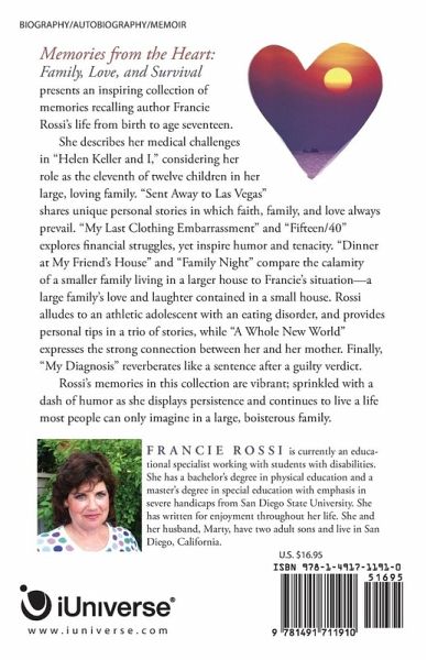Memories from the Heart: Family, Love, and Survival presents an inspiring collection of memories recalling author Francie Rossi’s life from birth to age seventeen. She describes her medical challenges in "Helen Keller and I," considering her role as the eleventh of twelve children in her large, loving family. "Sent Away to Las Vegas" shares unique personal stories in which faith, family, and love always prevail. "My Last Clothing Embarrassment" and "Fifteen/40" explores financial struggles, yet inspire humor and tenacity. "Dinner at My Friend’s House" and "Family Night" compare the calamity of a smaller family living in a larger house to Francie’s situation—a large family’s love and laughter contained in a small house. Rossi alludes to an athletic adolescent with an eating disorder, and provides personal tips in a trio of stories, while "A Whole New World" expresses the strong connection between her and her mother. Finally, "My Diagnosis" reverberates like a sentence after a guilty verdict. Rossi’s memories in this collection are vibrant; sprinkled with a dash of humor as she displays persistence and continues to live a life most people can only imagine in a large, boisterous family.