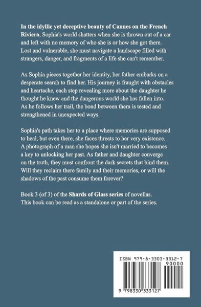 In the idyllic yet deceptive beauty of Cannes on the French Riviera, Sophia's world shatters when she is thrown out of a car and left with no memory of who she is or how she got there. Lost and vulnerable, she must navigate a landscape filled with strangers, danger, and fragments of a life she can't remember. As Sophia pieces together her identity, her father embarks on a desperate search to find her. His journey is fraught with obstacles and heartache, each step revealing more about the daughter he thought he knew and the dangerous world she has fallen into. As he follows her trail, the bond between them is tested and strengthened in unexpected ways. Sophia's path takes her to a place where memories are supposed to heal, but even there, she faces threats to her very existence. A photograph of a man she hopes she isn't married to becomes a key to unlocking her past. As father and daughter converge on the truth, they must confront the dark secrets that bind them. Will they reclaim their family and their memories, or will the shadows of the past consume them forever? Book 3 (of 3) of the Shards of Glass series of novellas. This book can be read as a standalone or part of the series.