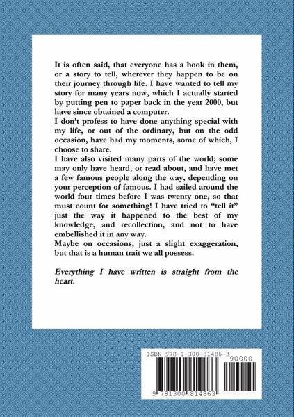 It is often said, that everyone has a book in them, or a story to tell, wherever they happen to be on their journey through life. I have wanted to tell my story for many years now, which I actually started by putting pen to paper back in the year 2000, but have since obtained a computer. I don't profess to have done anything special with my life, or out of the ordinary, but on the odd occasion, have had my moments, some of which, I choose to share. I have also visited many parts of the world; some may only have heard, or read about, and have met a few famous people along the way, depending on your perception of famous. I had sailed around the world four times before I was twenty one, so that must count for something! I have tried to "tell it" just the way it happened to the best of my knowledge, and recollection, and not to have embellished it in any way. Maybe on occasions, just a slight exaggeration, but that is a human trait we all possess. Everything I have written is straight from the heart.