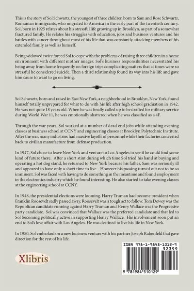 This is the story of Sol Schwartz, the youngest of three children born to Sam and Rose Schwartz, Romanian immigrants, who migrated to America in the early part of the twentieth century. Sol, born in 1925, relates about his stressful life growing up in Brooklyn as part of a somewhat fractured family. He relates his struggles with education, jobs, and business ventures and his battles with cancer throughout most of his life that was constantly attacking members of his extended family as well as himself. Being widowed twice forced Sol to cope with the problems of raising three children in a home environment with different mother images. Sols business responsibilities necessitated his being away from home frequently on foreign trips, complicating matters that at times were so stressful he considered suicide. Then a third relationship found its way into his life and gave him cause to want to go on living.