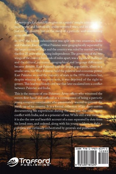 Memories of a Lacerated Heart gives us a painful insight into one of the most brutal and historically under-reported wars, and its effects not just on the country but on the mind of a patriotic and unassuming army officer. In 1947 the Indian subcontinent was split into two countries, India and Pakistan. East and West Pakistan were geographically separated by the larger nation of India and the country was ruled by martial law for the first 25 years after gaining independence. The governing of the two wings of the country, hundreds of miles apart, was a logistical challenge and the cultural, economic, geographical and language differences became divisive. East Pakistan had the larger population, albeit in a smaller area, but West Pakistan held the political and economic power. East Pakistan secured the majority of seats in the 1970 elections but, despite winning the majority vote, it was deprived of the right to govern. This lead to a bloody civil war that later escalated into a conflict between Pakistan and India. This is the memoir of one Pakistani Army officer who witnessed the events first-hand and suffered as a consequence of being a patriotic young company commander who passionately wanted to prevent the break-up of his country. It is a formal collection of his diary entries documenting his experiences during the civil war, the subsequent conflict with India, and as a prisoner of war. While still a war memoir, it is also the raw and heartfelt account of a man separated by duty from his loved ones, and ordered, along with his young soldiers, to fight a pointless war ruthlessly orchestrated by generals and politicians.