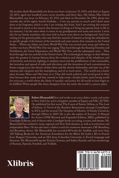 My mother, Ruth Blumenfeld, née Korn, was born on January 15, 1915; and died on August 18, 2015, aged one hundred years, seven months, and three days. My father, Max David Blumenfeld, was born on February 25, 1911 and died on December 26, 1994, about two months shy of his eighty-fourth birthday... I love my parents so much and I don't want them to be forgotten, which is why I am writing this book. And I am writing this memoir for myself as much as for anyone else, because in doing so I bring my parents back to life in my memory. I do the same when it comes to my grandparents and aunts and uncles. I write also for my family members, who may wish to know more about our background. And I am writing for the general public, who may find this memoir of interest as being the embodiment in specific people of the history of the twentieth and early twenty-first centuries in the United States... When my father was born, World War One was several years away, and when my mother was born, World War One was raging. They lived through the Roaring Twenties and Prohibition, the Great Depression, and World War Two, and the subsequent wars... They lived through the rise and fall of the Soviet Union. The technological changes in their lifetime were the greatest in human history, from the evolution and ubiquity of the telephone, and of electricity and electric lighting, to airplane travel and the proliferation of the automobile, the invention and spread of radio and television, and the invention of such conveniences as frozen orange juice, the electric clothes drier, and the electric dishwasher, and, later on, of the internet, the computer and the smartphone, and of so much more... The world was a better place because Mom and Dad were in it. They did much political and social good in their time because they cared, and they wanted to help create a kinder, better, more loving world for everyone, a world where the ideals of equality and justice for all would at least begin to be fulfilled. When people like them disappear from the earth, the world is a poorer place.