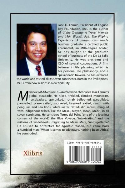 Memories of Adventure: A Travel Memoir chronicles Jose Fermin's global escapade. He hiked, trekked, climbed mountains, horsebacked, spelunked, hot-air ballooned, paraglided, parasailed, plane sailed, snorkeled, kayaked, sailed, swam with penguins and sea lions, white-water rafted, did safaris, mingled with indigenous tribes, like the Masai, Mayan, Incan, Maori, in all seven continents. He considers Torres del Paine "one of the loveliest corners of the world," the Blue Voyage, "intoxicating," and the millions of wildebeests, migrating to Masai Mara, "unforgettable." He cruised to Antarctica for egoistic reason, but came back a humbled man. "When it comes to adventure, nothing beats Africa," he concluded.