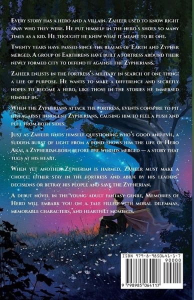 Every story has a hero and a villain. Zaheer used to know right away who they were. He put himself in the hero's shoes so many times as a kid. He thought he knew what it meant to be one. Twenty years have passed since the realms of Earth and Zypher merged. A group of Earthrens have built a fortress around their newly formed city to defend it against the Zypherians. Zaheer enlists in the fortress's military in search of one thing: a life of purpose. He wants to make a difference and secretly hopes to become a hero, like those in the stories he immersed himself in. When the Zypherians attack the fortress, events conspire to pit him against innocent Zypherians, causing him to feel a push and pull from both sides.Just as Zaheer finds himself questioning who's good and evil, a sudden burst of light from a pond shows him the life of Hero Akai, a Zypherian born before the worlds merged-a story that tugs at his heart. When yet another Zypherian is harmed, Zaheer must make a choice: either stay in the fortress and abide by his leaders' decisions or betray his people and save the Zypherian. A debut novel in the young adult fantasy genre, Memories of Hero will embark you on a tale filled with moral dilemmas, memorable characters, and heartfelt moments.
