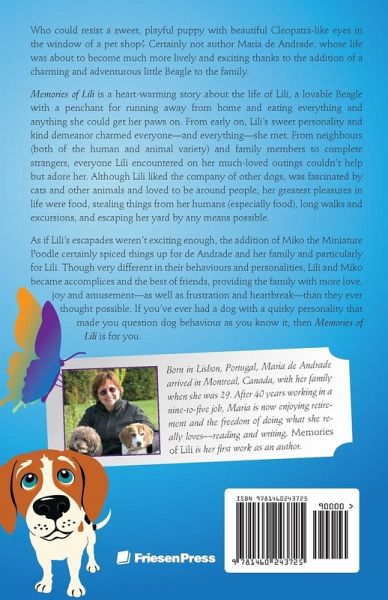 Who could resist a sweet, playful puppy with beautiful Cleopatra-like eyes in the window of a pet shop? Certainly not author Maria de Andrade, whose life was about to become much more lively and exciting thanks to the addition of a charming and adventurous little Beagle to the family. Memories of Lili is a heart-warming story about the life of Lili, a lovable Beagle with a penchant for running away from home and eating everything and anything she could get her paws on. From early on, Lili's sweet personality and kind demeanor charmed everyone-and everything-she met. From neighbours (both of the human and animal variety) and family members to complete strangers, everyone Lili encountered on her much-loved outings couldn't help but adore her. Although Lili liked the company of other dogs, was fascinated by cats and other animals and loved to be around people, her greatest pleasures in life were food, stealing things from her humans (especially food), long walks and excursions, and escaping her yard by any means possible. As if Lili's escapades weren't exciting enough, the addition of Miko the Miniature Poodle certainly spiced things up for de Andrade and her family and particularly for Lili. Though very different in their behaviours and personalities, Lili and Miko became accomplices and the best of friends, providing the family with more love, joy and amusement-as well as frustration and heartbreak-than they ever thought possible. If you've ever had a dog with a quirky personality that made you question dog behaviour as you know it, then Memories of Lili is for you.