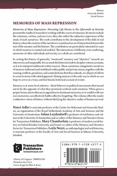 Memories of Mass Repression presents the results of researchers working with the voices of witnesses. Its stories include the witnesses, victims, and survivors; it also reflects the subjective experience of the study of such narratives. The work contributes to the development of the field of oral history, where the creation of the narrative is considered an interaction between the text of the narrator and the listener. The contributors are particularly interested in ways in which memory is created and molded. The interactions of different, even conflicting, memories of other individuals, and society as a whole are considered.In writing the history of genocide, "emotional" memory and "objective" research are interwoven and inseparable. It is as much the historian's task to decipher witness account, as it is to interpret traditional written sources. These sometimes antagonistic narratives of memory fashioned and mobilized within public and private arenas, together with the ensuing conflicts, paradoxes, and contradictions that they unleash, are all part of efforts to come to terms with what happened. Mining memory is the only way in which we can hope to arrive at a truer, and less biased historical account of events.Memory is at some level selective. Most believers in political movements turned out to be the opposite of what they promised. When given a proper forum, stories that are in opposition to dominant memories, or in conflict with our own memories, can effectively battle collective forgetting. This volume offers the reader a vision of the subjective side of history without falsifying the objective reality of human survival.