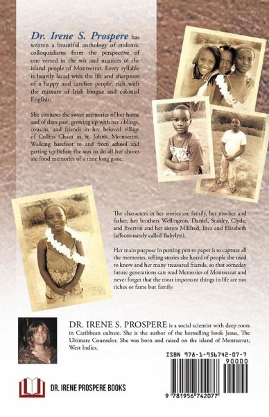 Dr. Irene S. Prospere has written a beautiful anthology of endemic colloquialisms from the perspective of one versed in the wit and nuances of the island people of Montserrat. Every syllable is heavily laced with the lilt and sharpness of a happy and carefree people, rich with the mixture of Irish brogue and colonial English. She conjures the sweet memories of her home and of days past, growing up with her siblings, cousins, and friends in her beloved village of Collins Ghaut in St. John's, Montserrat. Walking barefoot to and from school and getting up before the sun to do all her chores are fond memories of a time long gone. The characters in her stories are family, her mother and father, her brothers Wellington, Daniel, Stanley, Clyde, and Everton and her sisters Mildred, Inez and Elizabeth (affectionately called Babylyn). Her main purpose in putting pen to paper is to capture all the memories, telling stories she heard of people she used to know and her many treasured friends, so that someday future generations can read Memories of Montserrat and never forget that the most important things in life are not riches or fame but family.