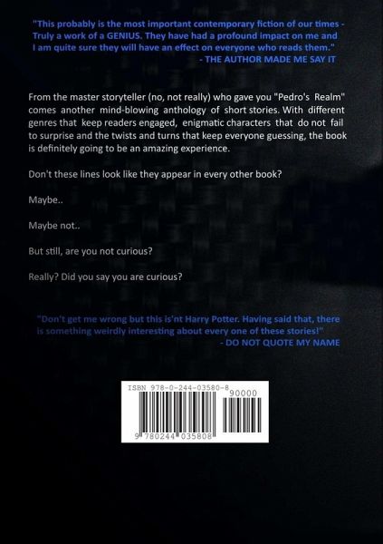 From the master storyteller (no, not really) who gave you "Pedro's Realm" comes another mind-blowing anthology of short stories. With different genres that keep readers engaged, enigmatic characters that spring a surprise and the twists and turns that keep everyone guessing, this book is definitely going to be an amazing experience. Don't these lines look like they appear in every other book? Maybe... Maybe not... But still, are you not curious? Really? Did you say you are curious?