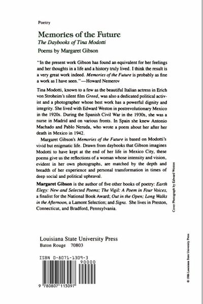 Tina Modotti, known to a few as the beautiful Italian actress in Erich von Stroheim's silent film Greed, was also a dedicated political activist and a photographer whose best work has a powerful dignity and integrity. She lived with Edward Weston in postrevolutionary Mexico in the 1920s. During the Spanish Civil War in the 1930s, she was a nurse in Madrid and on various fronts. In Spain she knew Antonio Machado and Pablo Neruda, who wrote a poem about her after her death in Mexico in 1942. Margaret Gibson's Memories of the Future is based on Modotti's vivid but enigmatic life. Drawn from daybooks that Gibson imagines Modotti to have kept at the end of her life in Mexico City, these poems give us the reflections of a woman whose intensity and vision, evident in her own photographs, are matched by the depth and breadth of her experience and personal transformation in times of deep social and political upheaval.