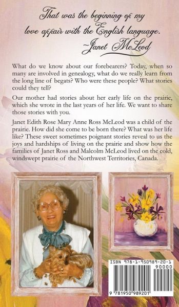 "That was the beginning of my love affair with the English language." ~Janet McLeod What do we know about our forebearers? Today, when so many are involved in genealogy, what do we really learn from the long line of begats? Who were these people? What stories could they tell? Our mother had stories about her early life on the prairie, which she wrote in the last years of her life. We want to share those stories with you. Janet Edith Rose Mary Anne Ross McLeod was a child of the prairie. How did she come to be born there? What was her life like? These sweet sometimes poignant stories reveal to us the joys and hardships of living on the prairie and show how the families of Janet Ross and Malcolm McLeod lived on the cold, windswept prairie of the Northwest Territories, Canada.