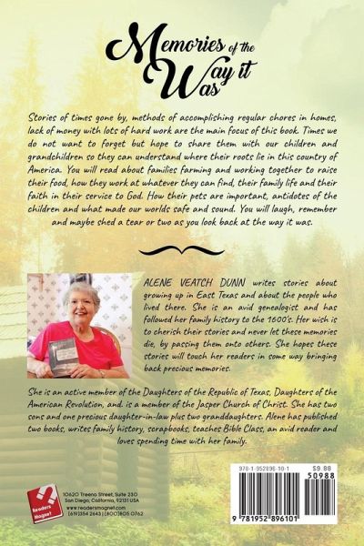 Stories of times gone by, methods of accomplishing regular chores in homes, lack of money with lots of hard work are the main focus of this book. Times we do not want to forget but hope to share them with our children and grandchildren so they can understand where their roots lie in this country of America. You will read about families farming and working together to raise their food, how they work at whatever they can find, their family life and their faith in their service to God. How their pets are important, antidotes of the children and what made our worlds safe and sound. You will laugh, remember and maybe shed a tear or two as you look back at the way it was.