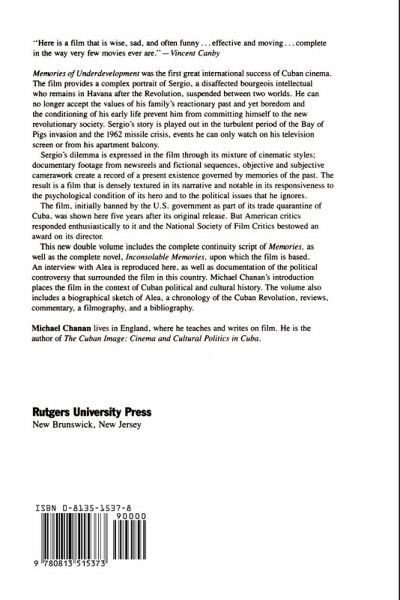 Memories of Underdevelopment was the first great international success of Cuban cinema. The film provides a complex portrait of Sergio, a disaffected bourgeois intellectual who remains in Havana after the Revolution, suspended between two worlds. He can no longer accept the values of his family's reactionary past and yet boredom and the conditioning of his early life prevent him from committing himself to the new revolutionary society. Sergio's story is played out in the turbulent period of the Bay of Pigs invasion and the 1962 missile crisis, events he can only watch on his television screen or from his apartment balcony.The film, initially banned by the U.S. government as part of its trade quarantine of Cuba, was shown here five years after its original release. But American critics responded enthusiastically to it and the National Society of Film Critics bestowed an award on its director.This double volume includes the complete continuity script of Memories, as well as the complete novel, Inconsolable Memories, upon which the film is based. An interview with Alea is reproduced here, as well as documentation of the political controversy that surrounded the film in this country. Michael Chanan's introduction places the film in the context of Cuban political and cultural history. The volume also includes a biographical sketch of Alea, a chronology of the Cuban Revolution, reviews, commentary, a filmography, and a bibliography.Michael Chanan lives in England, where he teaches and writes on film. He is the author of The Cuban Image: Cinema and Cultural Politics in Cuba.