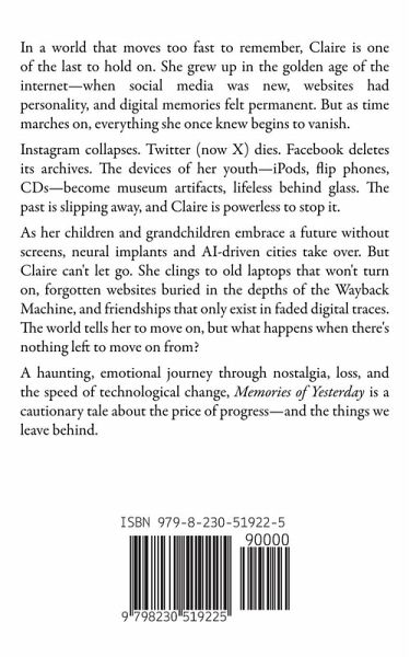 In a world that moves too fast to remember, Claire is one of the last to hold on. She grew up in the golden age of the internet-when social media was new, websites had personality, and digital memories felt permanent. But as time marches on, everything she once knew begins to vanish. Instagram collapses. Twitter (now X) dies. Facebook deletes its archives. The devices of her youth-iPods, flip phones, CDs-become museum artifacts, lifeless behind glass. The past is slipping away, and Claire is powerless to stop it. As her children and grandchildren embrace a future without screens, neural implants and AI-driven cities take over. But Claire can't let go. She clings to old laptops that won't turn on, forgotten websites buried in the depths of the Wayback Machine, and friendships that only exist in faded digital traces. The world tells her to move on, but what happens when there's nothing left to move on from? A haunting, emotional journey through nostalgia, loss, and the speed of technological change, Memories of Yesterday is a cautionary tale about the price of progress-and the things we leave behind.