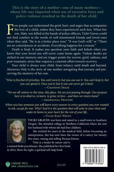 This is the story of a mother-one of many mothers-whose life was impacted when use of excessive force and police violence resulted in the death of her child. Few people can understand the grief, hurt, and anger that accompanies the loss of a child, unless they have experienced such loss. When her son, Matt, was killed at the hands of police officers, Vicki Graves could not find comfort in the words of well-intentioned friends and loved ones when they said, "He is in a better place now," "It was God's will," or "There are no coincidences or accidents. Everything happens for a reason." Death is final. It makes you question your faith and beliefs when you know that your loved one will never come home again. Violent deaths are etched in our memory and are trigger points for sorrow, grief, sadness, and post-traumatic stress that requires a constant effort toward recovery. Your child is always your child, from infancy until death and beyond. Memories Only is the story of one mother navigating that journey and preserving the memory of her son.