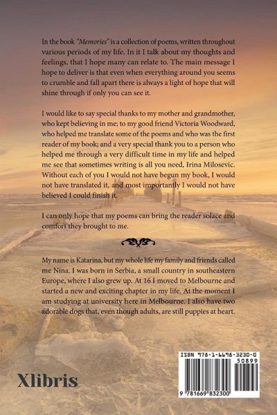In the book "Memories" is a collection of poems, written throughout various periods of my life. In it I talk about my thoughts and feelings, that I hope many can relate to. The main message I hope to deliver is that even when everything around you seems to crumble and fall apart there is always a light of hope that will shine through if only you can see it. I would like to say special thanks to my mother and grandmother, who kept believing in me; to my good friend Victoria Woodward, who helped me translate some of the poems and who was the first reader of my book; and a very special thank you to a person who helped me through a very difficult time in my life and helped me see that sometimes writing is all you need, Irina Milosevic. Without each of you I would not have begun my book, I would not have translated it, and most importantly I would not have believed I could finish it. I can only hope that my poems can bring the reader solace and comfort they brought to me.