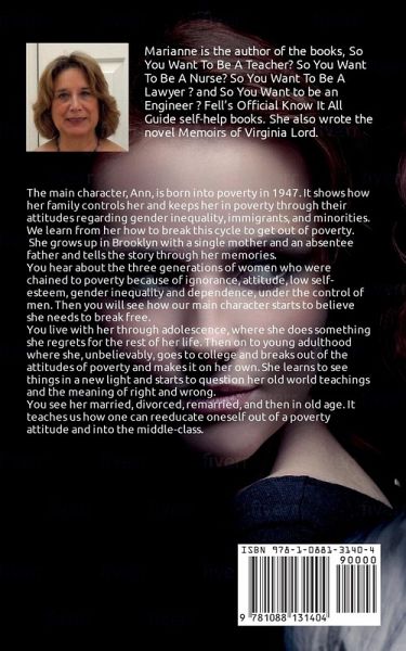 The main character, Ann, is born into poverty in 1947. It shows how her family controls her and keeps her in poverty through their attitudes regarding gender inequality, immigrants, and minorities. We learn from her how to break this cycle to get out of poverty. She grows up in Brooklyn with a single mother and an absentee father and tells the story through her memories. You hear about the three generations of women who were chained to poverty because of ignorance, attitude, low self-esteem, gender inequality, and dependence, under the control of men. Then you will see how our main character starts to believe she needs to break free. You live with her through adolescence, where she does something she regrets for the rest of her life. Then on to young adulthood where she, unbelievably, goes to college and breaks out of the attitudes of poverty and makes it on her own. She learns to see things in a new light and starts to question her old-world teachings and the meaning of right and wrong. You see her married, divorced, remarried, and then in old age. It teaches us how one can reeducate oneself out of a poverty attitude and into the middle class.