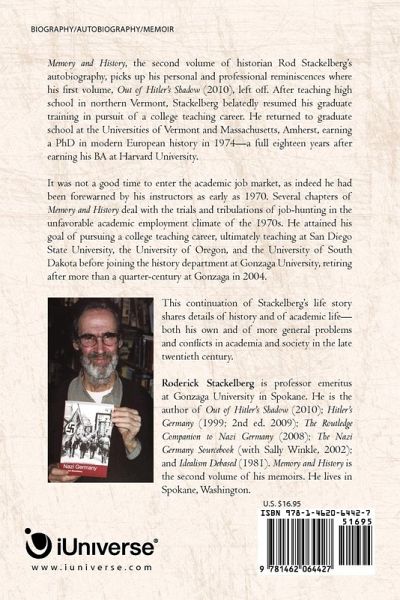 Memory and History, the second volume of historian Rod Stackelberg's autobiography, picks up his personal and professional reminiscences where his first volume, Out of Hitler's Shadow (2010), left off. After teaching high school in northern Vermont, Stackelberg belatedly resumed his graduate training in pursuit of a college teaching career. He resumes his graduate education at the Universities of Vermont and Massachusetts, Amherst, earning a PhD in modern European history in 1974-a full eighteen years after earning his BA at Harvard University. It was not a good time to enter the academic job market, as indeed he had been forewarned by his instructors as early as 1970. Several chapters of Memory and History deal with the trials and tribulations of job-hunting in the unfavorable academic employment climate of the 1970s. He ultimately attained his goal of pursuing a college teaching career, ultimately teaching at San Diego State University, the University of Oregon, and the University of South Dakota before joining the history department at Gonzaga University, retiring after more than a quarter-century at Gonzaga in 2004. This continuation of Stackelberg's life story shares details of history and of academic life-both his own and of more general problems and conflicts in that sphere in the late twentieth century.