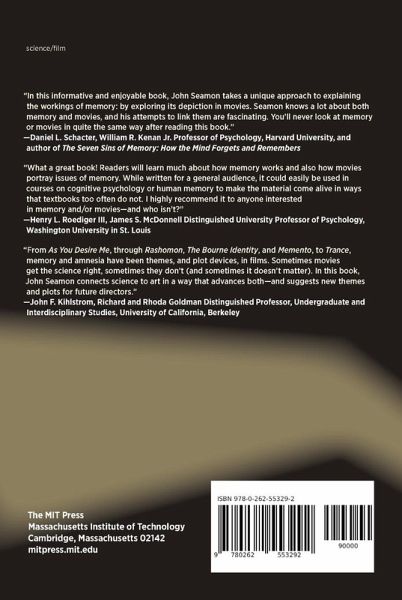 How popular films from Memento to Slumdog Millionaire can help us understand how memory works. In the movie Slumdog Millionaire, the childhood memories of a young game show contestant trigger his correct answers. In Memento, the amnesiac hero uses tattoos as memory aids. In Away from Her, an older woman suffering from dementia no longer remembers who her husband is. These are compelling films that tell affecting stories about the human condition. But what can these movies teach us about memory? In this book, John Seamon shows how examining the treatment of memory in popular movies can shed new light on how human memory works. After explaining that memory is actually a diverse collection of independent systems, Seamon uses examples from movies to offer an accessible, nontechnical description of what science knows about memory function and dysfunction. In a series of lively encounters with numerous popular films, he draws on Life of Pi and Avatar, for example, to explain working memory, used for short-term retention. He describes the process of long-term memory with examples from such films as Cast Away and Groundhog Day; The Return of Martin Guerre, among other movies, informs his account of how we recognize people; the effect of emotion on autobiographical memory is illustrated by The Kite Runner, Titanic, and other films; movies including Born on the Fourth of July and Rachel Getting Married illustrate the complex pain of traumatic memories. Seamon shows us that movies rarely get amnesia right, often using strategically timed blows to the protagonist's head as a way to turn memory off and then on again (as in Desperately Seeking Susan). Finally, he uses movies including On Golden Pond and Amour to describe the memory loss that often accompanies aging, while highlighting effective ways to maintain memory function.
