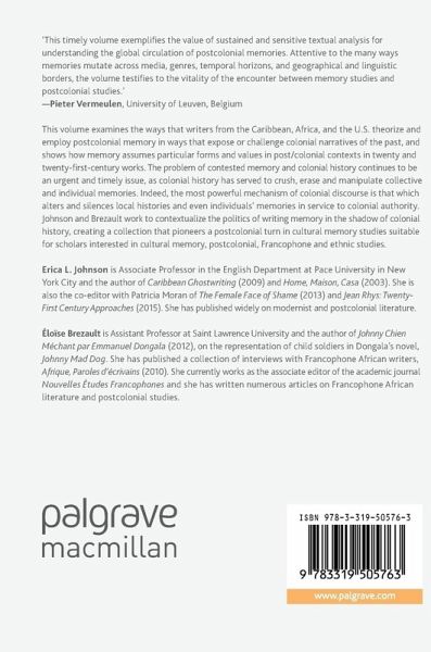 This volume examines the ways that writers from the Caribbean, Africa, and the U.S. theorize and employ postcolonial memory in ways that expose or challenge colonial narratives of the past, and shows how memory assumes particular forms and values in post/colonial contexts in twenty and twenty-first-century works. The problem of contested memory and colonial history continues to be an urgent and timely issue, as colonial history has served to crush, erase and manipulate collective and individual memories. Indeed, the most powerful mechanism of colonial discourse is that which alters and silences local histories and even individuals' memories in service to colonial authority. Johnson and Brezault work to contextualize the politics of writing memory in the shadow of colonial history, creating a collection that pioneers a postcolonial turn in cultural memory studies suitable for scholars interested in cultural memory, postcolonial, Francophone and ethnic studies. Includes a foreword by Marianne Hirsch.