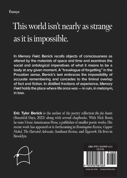 In Memory Field, Benick recalls objects of consciousness as altered by the materials of space and time and examines the social and ontological imperatives of what it means to be a body at any given moment. A "travelogue of forgetting" in the Proustian sense, Benick's text embraces the impossibility of accurate remembering and concedes to the liminal overlap of fact and fiction. In distilled fractions of experience, Memory Field holds the place where life once was - in ruin, in metonym, in loss.