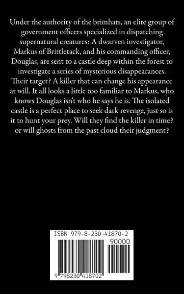 Under the authority of the brimhats, an elite group of government officers specialized in dispatching supernatural creatures: A dwarven investigator, Markus of Brittletack, and his commanding officer, Douglas, are sent to a castle deep within the forest to investigate a series of mysterious disappearances. Their target? A killer that can change his appearance at will. It all looks a little too familiar to Markus, who knows Douglas isn't who he says he is. The isolated locale is a perfect place to seek dark revenge, just so is it to hunt your prey. Will they find the killer in time? or will ghosts from the past cloud their judgment?