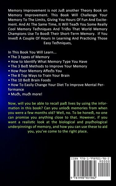 Memory Improvement is not Just another Theory Book on Memory Improvement. This Book Will Challenge Your Memory To The Limits, Giving You Hours Of Fun And Excitement. And At The Same Time, It Will Teach You Some Really Cool Memory Techniques And Tricks That World Memory Champions Use To Boost Their Short-Term Memory. If You Invest A Couple Of Hours In Learning And Practicing Those Easy Techniques, In This Book You Will Learn...The 3 types of Memory How to Identify What Memory Type You Have The 3 Best Methods to Improve Your Memory How Poor Memory Affects You The 8 Top Ways to Train Your Brain The 10 Best Brain Foods How To Easily Change Your Diet To Improve Mental Performance Much, much more! Now, will you be able to recall past lives by using the information in this book? Can you unlock memories from when you were a few months old? Well, no. To be honest, no one can promise you anything close to that. However, if you want a realistic look at the biological and psychological underpinnings of memory, and how you can use these to aid you, you've come to the right place.