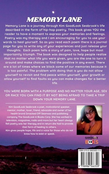 Memory Lane is a poetry book with self help writing techniques. The journey through Kim GoodLook Seabrook's life described in the form of hip-hop healing poetry. This book gives YOU the reader to have a moment to express your memories and feelings. Poetry was my therapy and I am encouraging for you to use your words and your thoughts to heal yourself. So as you read each poem there is a journal page with a writing prompt for you to help share your experiences and just release your thoughts with no judgement. Each poem tells a story of pain, love, hope but most importantly triumph. The book was designed to help people realize that no matter what life you were given, you are the one to turn it around and make choices to find the positive in any event. There are a lot of times where we block some of our memories because it is too painful. The problem with doing so is, that it does not allow yourself to revisit and find peace within yourself, your growth or to find faults so you can make changes for a better life.
