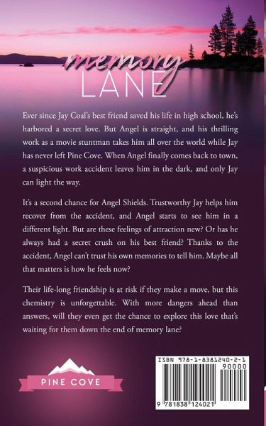 Ever since Jay Coal's best friend saved his life in high school, he's harbored a secret love. But Angel is straight, and his thrilling work as a movie stuntman takes him all over the world while Jay has never left Pine Cove. When Angel finally comes back to town, a suspicious work accident leaves him in the dark, and only Jay can light the way. It's a second chance for Angel Shields. Trustworthy Jay helps him recover from the accident, and Angel starts to see him in a different light. But are these feelings of attraction new? Or has he always had a secret crush on his best friend? Thanks to the accident, Angel can't trust his own memories to tell him. Maybe all that matters is how he feels now? Their life-long friendship is at risk if they make a move, but this chemistry is unforgettable. With more dangers ahead than answers, will they even get the chance to explore this love that's waiting for them down the end of memory lane? Book Five of Pine Cove. Memory Lane is a steamy, standalone MM romance novel with a guaranteed HEA and absolutely no cliffhanger.