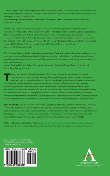 Taking the absence of Aboriginal people in South Australian settler descendants' historical consciousness as a starting point, 'Memory, Place and Settler¿Aboriginal History' combines the methodologies and theories of historical enquiry, anthropology and memory studies to investigate the multitudinous and intertwined ways the colonial past is known, represented and understood by current generations.