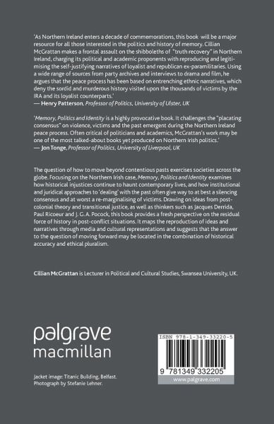 Memory, Politics and Identity is a highly provocative book. It challenges the 'placating consensus' on violence, victims and the past emergent during the Northern Ireland peace process. Often critical of politicians and academics, McGrattan's work may be one of the most talked-about books yet produced on Northern Irish politics. Jon Tonge Professor of Politics, University of Liverpool As Northern Ireland enters a decade of commemorations this book will be a major resource for all those interested in the politics and history of memory. Cillian McGrattan makes a frontal assault on the shibboleths of 'truth recovery' in Northern Ireland charging its political and academic proponents with reproducing and legitimising the self-justifying narratives of loyalist and republican ex-paramilitaries. Using a wide range of sources from party archives and interviews to drama and film he argues that the peace process has been based on entrenching ethnic narratives which deny the sordid and murderous history visited upon the thousands of victims by the IRA and its loyalist counterparts. Henry Patterson Professor of Politics, University of Ulster, UK.